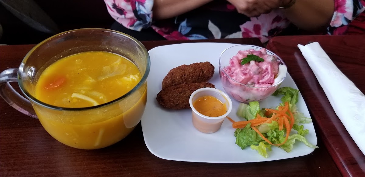 If you’re in the mood for seafood, the Accra (fried fritters made with salted cod) is a must-try appetizer. The golden-brown fritters are crispy on the outside while remaining soft and flavorful on the inside. For something a bit heartier, the Joumou soup, a Haitian pumpkin soup typically served on New Year's Day, is available year-round at Gingerbites. This dish, made with squash, beef, and vegetables, is both comforting and rich in flavor, offering a satisfying meal on any occasion.